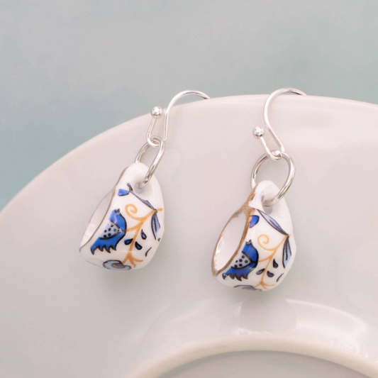 Blue and Yellow Ceramic Teacup Dangle Earrings