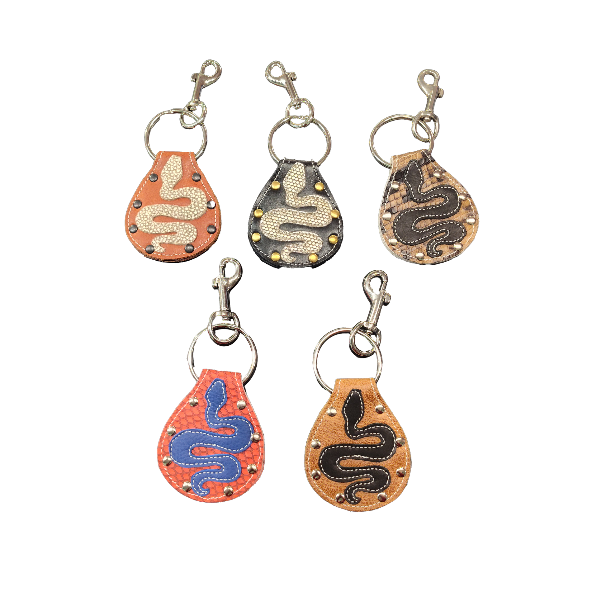 Another visually striking keychain made locally by Adriane Handmade! An assortment of soft brown or black leather makes up the body of these keychains with an iconic slithering snake appliqué beautifully stitched on the front and complimenting black studs. Choose your favorite color combination! High quality leatherwork, a uniquely versatile design, environmentally conscious crafting AND made by hand in our own community! This keychain makes a beautiful and lasting gift to the serpent lover in your life! Or anyone with exceptional style!