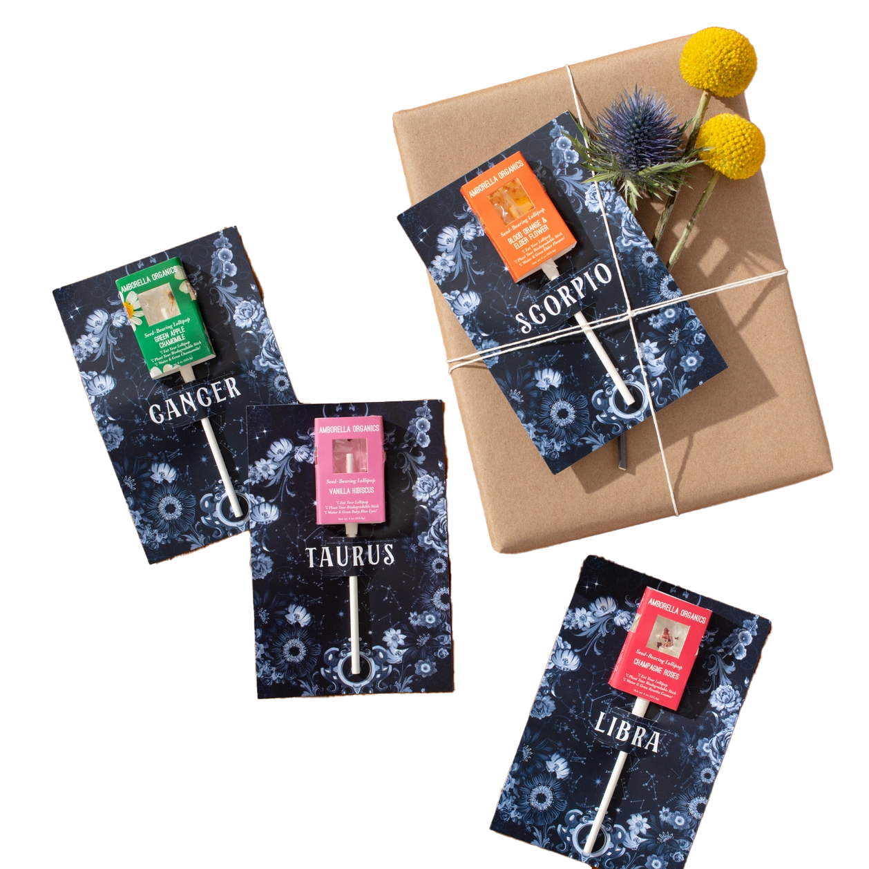 Let the stars guide your gift-giving with our Astrology Cards — each featuring a handcrafted, seed-bearing lollipop specially paired to your zodiac sign by an astrologer and herbalist.