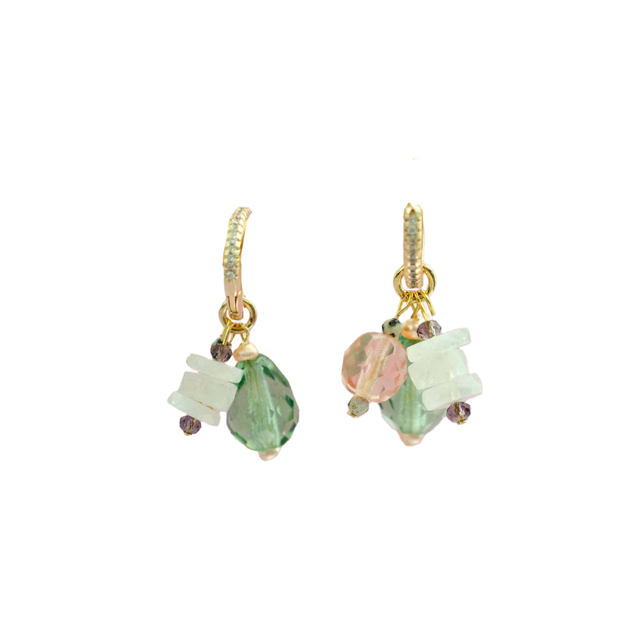 Handmade charm earrings featuring 14mm rhinestone beaded hoops with a mix of Czech glass and gemstone beads. Finished with a Czech tourmaline green teardrop bead, pink Czech glass, and moonstone accents.
