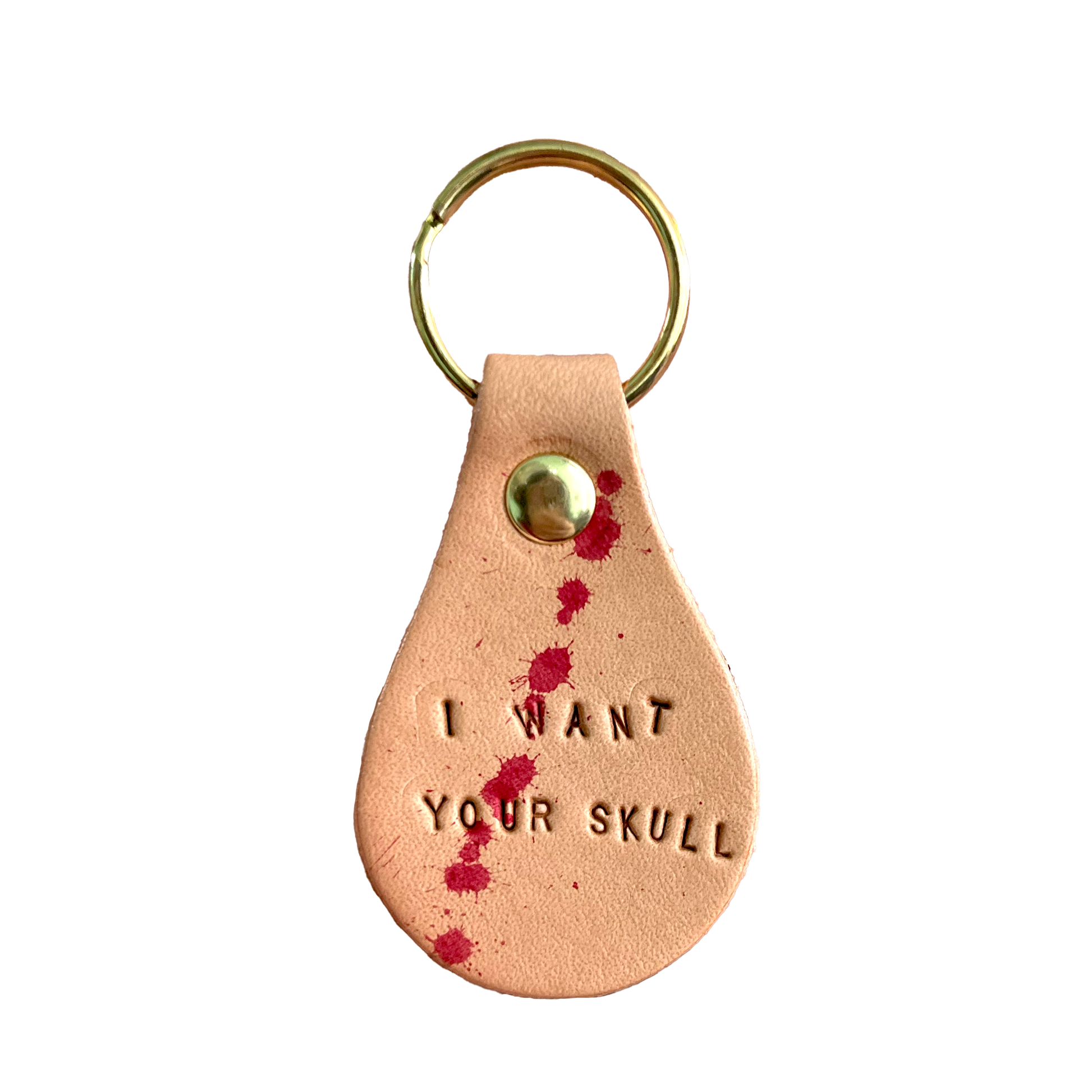 Another visually striking keychain made locally by Adriane Handmade! A smooth flesh colored leather makes up the body of this keychain with "I want your skull" stamped into it and complimenting blood splatters. High quality leatherwork, a uniquely versatile design, environmentally conscious crafting AND made by hand in our own community! This keychain makes a beautiful and lasting gift to the macabre lover in your life! Or anyone with exceptional style!