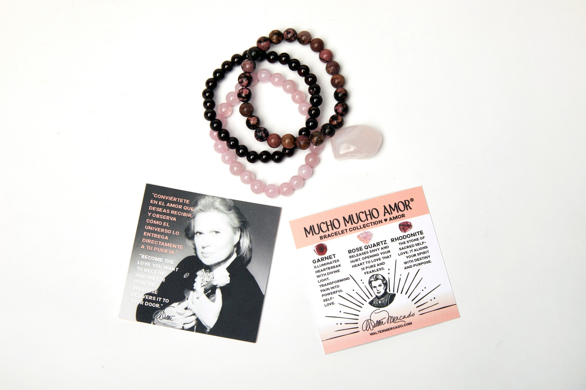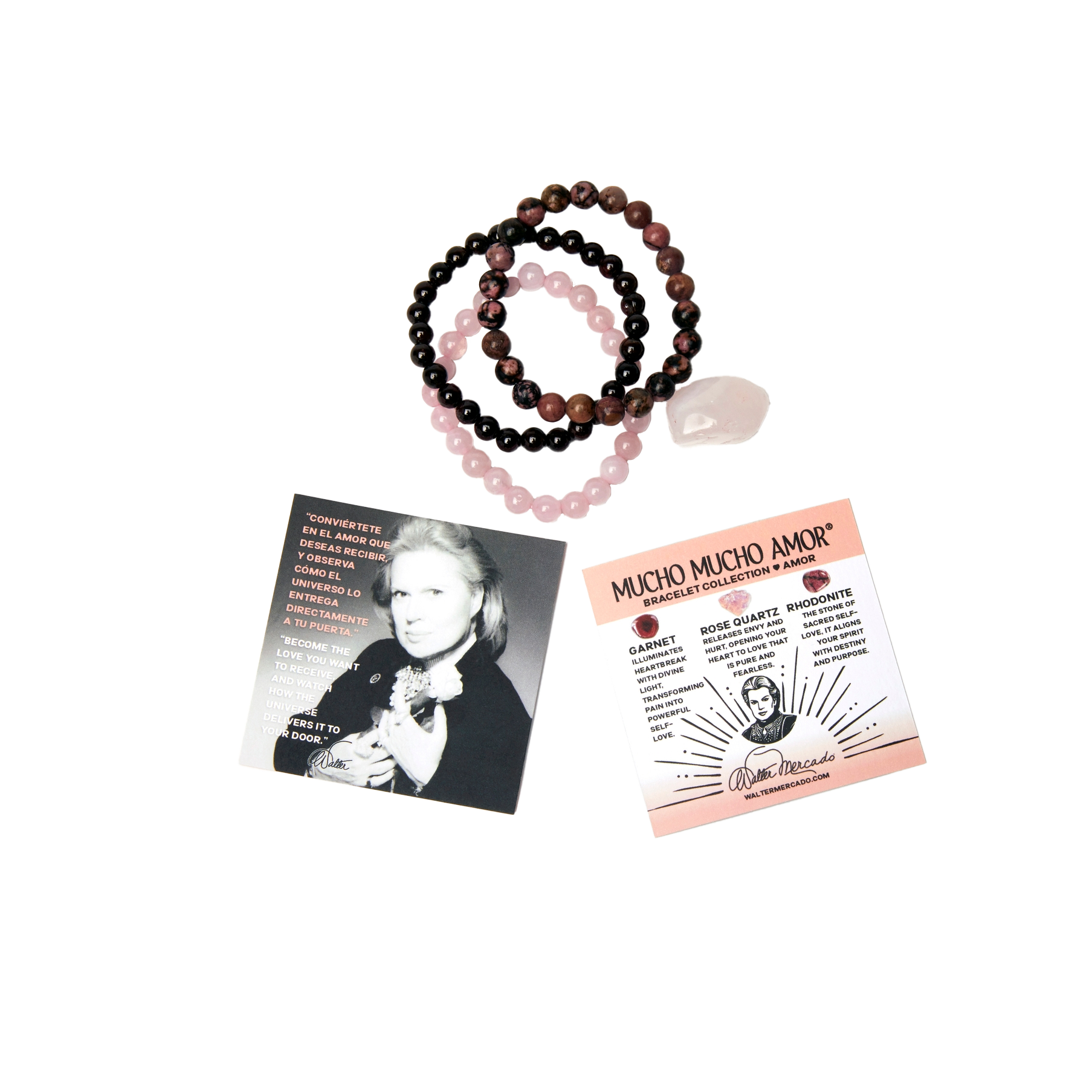 Three beautifully crafted crystal bracelets, each radiating the energy of love. Wear them together or individually to attract what you desire into your life! Comes with an information card about the stones, a quote from Walter Mercado, and a small correlating stone.