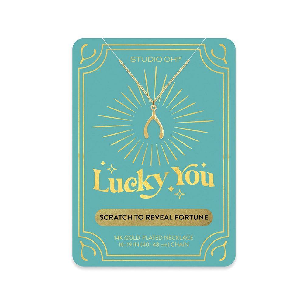 Plated in 14K gold on an adjustable chain. Each necklace is displayed securely on a sturdy backer card embellished with eye-catching gold foil—and for an uplifting surprise, each card also features a scratch-off fortune!